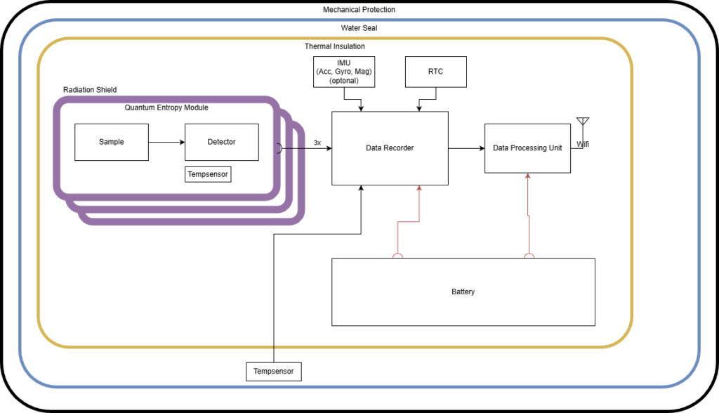 The architecture separates physical sensing, entropy estimation, conditioning, storage, and presentation into independent modules to allow verification and future scaling.